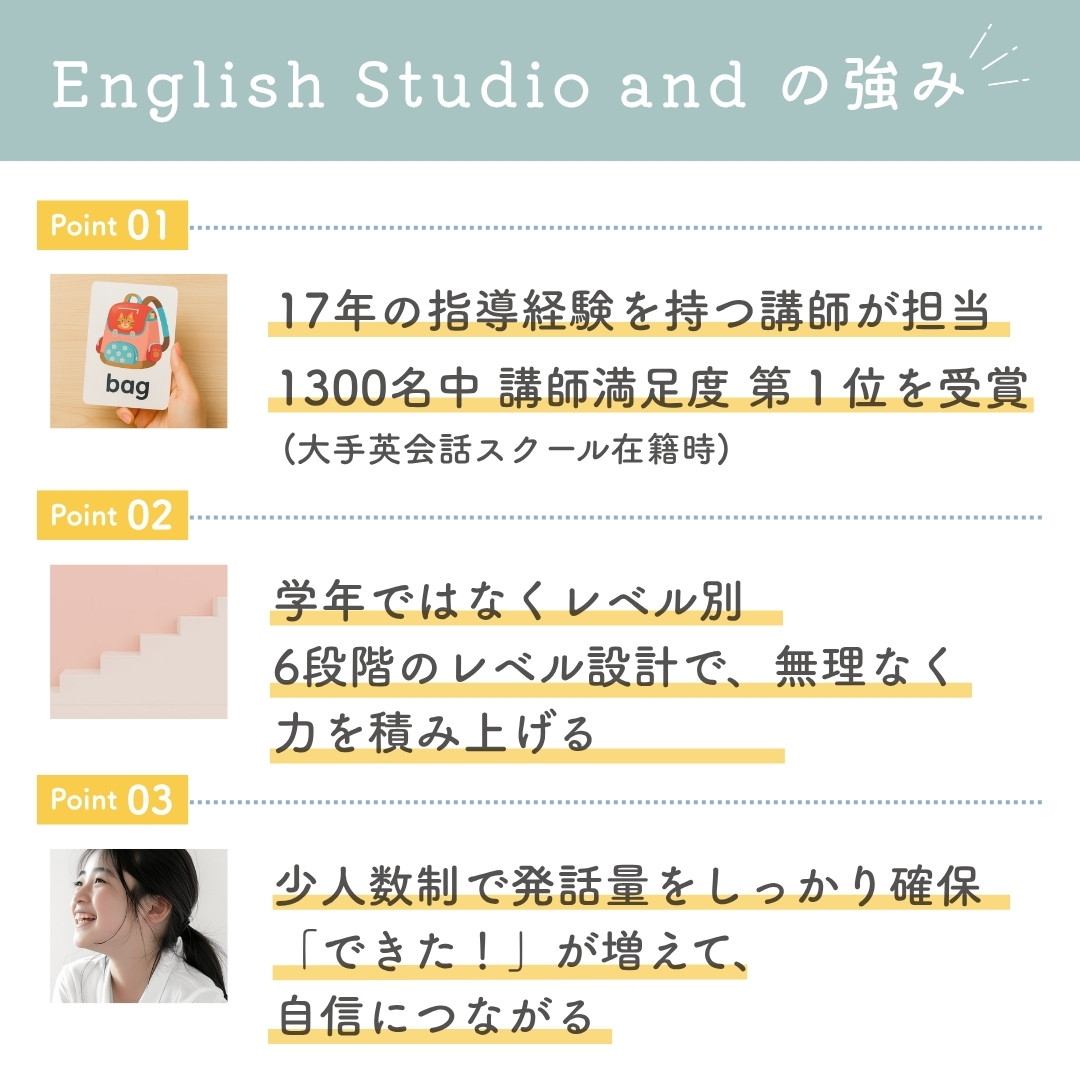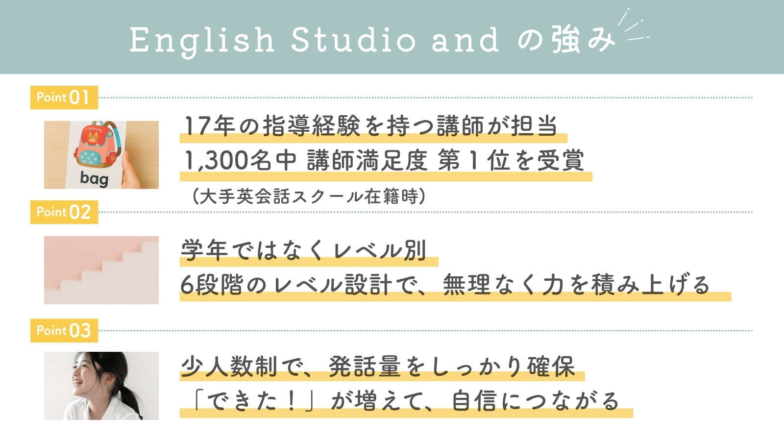 English Studio and は、小学生を中心に少人数で英会話レッスンを行い、無理なく段階的に英語力を身につけるスクールです。