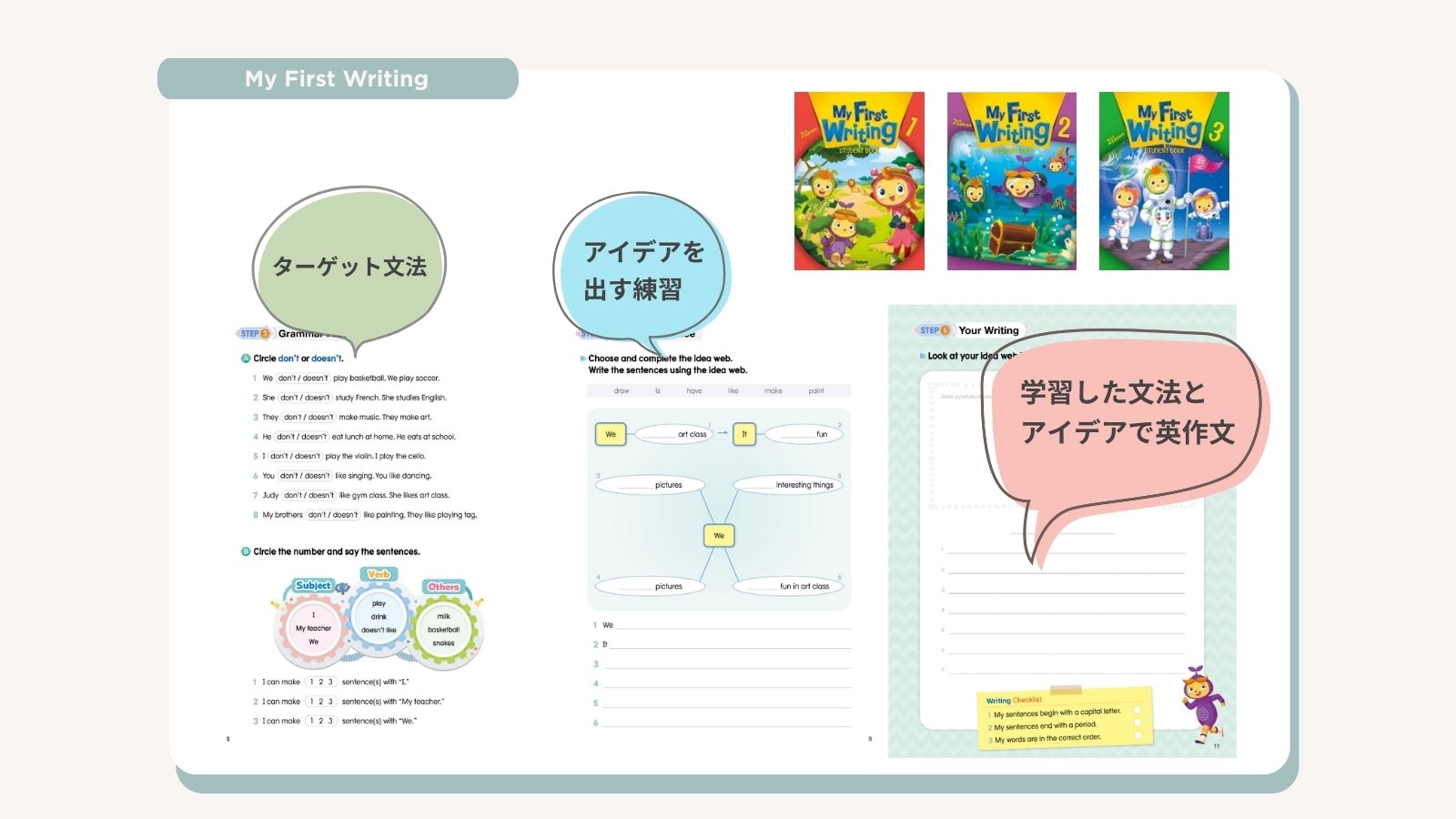 読む・話すから、書いて伝える力へと段階的にステップアップしていく教材です。