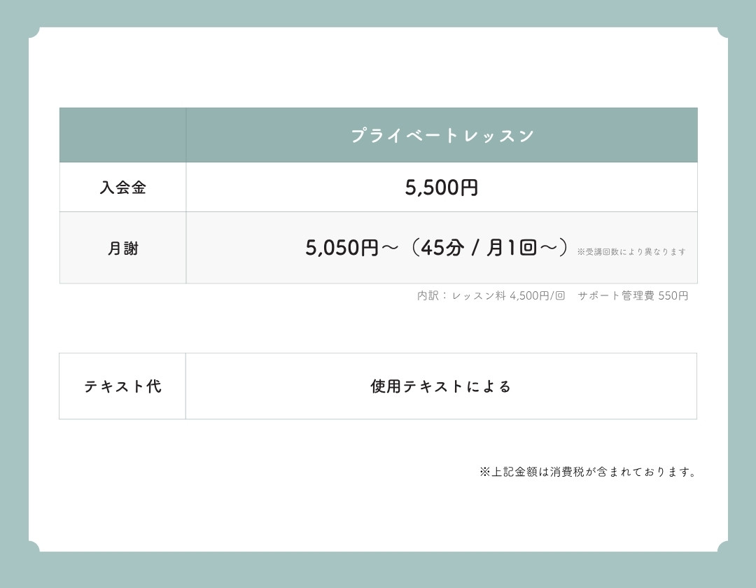 毎月のレッスン回数に応じて、月ごとのお支払いとなります。